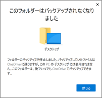 各フォルダーについてバックアップが停止されると、「このフォルダーはバックアップされなくなりました」というメッセージが表示され、OneDriveのバックアップ設定は解除されます。