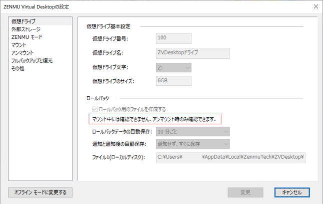 v1.4から「ロールバック」の下に「マウント中は確認できません。アンマウント時のみ確認できます。」と表示されています。これは、アンマウント時の設定画面では最新ロールバックデータの保存が確認可能となりました。ただし、マウント時には定期的にロールバックデータが更新されているため確認できません。ページのトップへ 5. ZENMUツールバーからの操作(ZENMUモードのみ)
